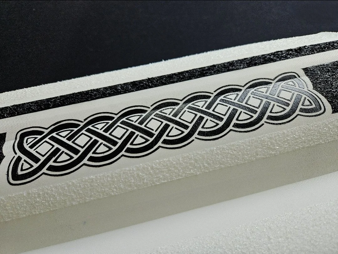 Scott is proud of his Celtic heritage. He was keen to celebrate this in the design and sent a Celtic knot design with a sketched design including pinlines. We had a lot of fun turning it into the real deal. People may know, I love clean monochrome mats and I really love this one!